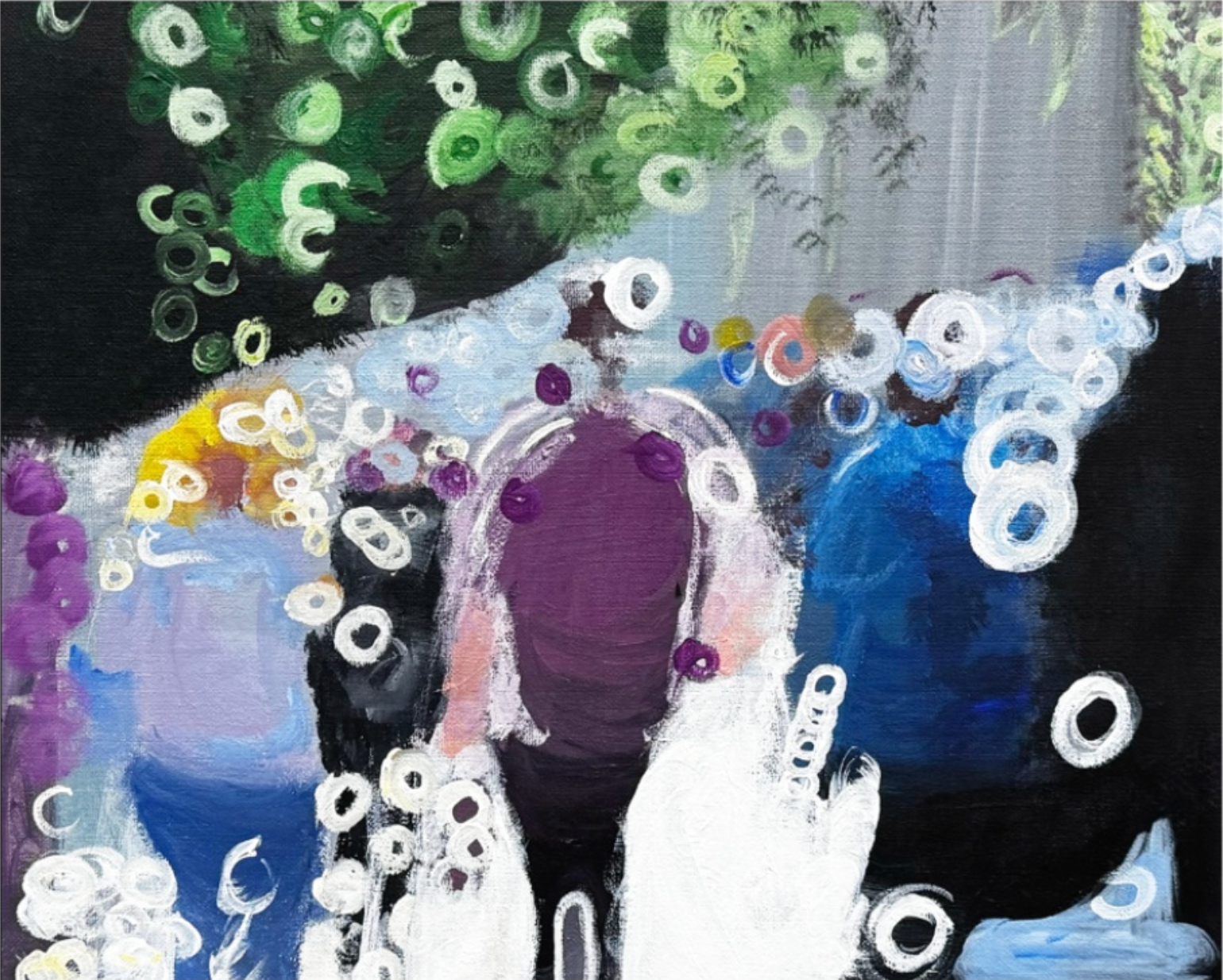 Painted layered circles and blurred figures to show how vision gets overwhelmed in busy places.