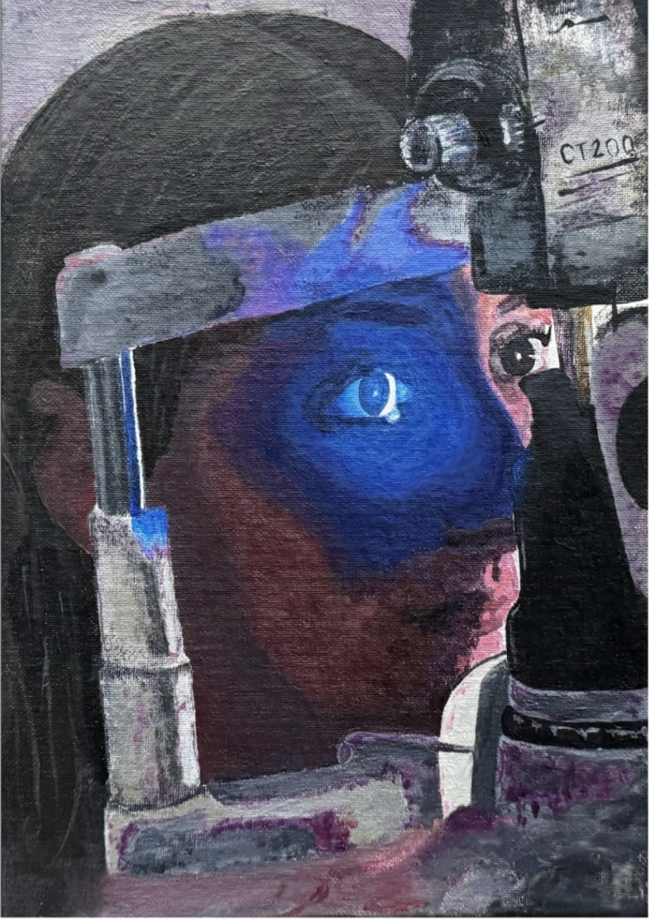 This piece represents my experience sitting in the eye doctor’s chair, a moment that used to bring me both anxiety and curiosity. I wanted to capture how something so ordinary could feel so personal and intense. Painting this helped me see beauty in a process that once made me feel vulnerable.